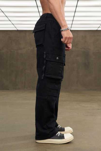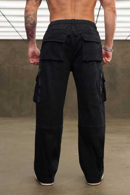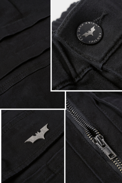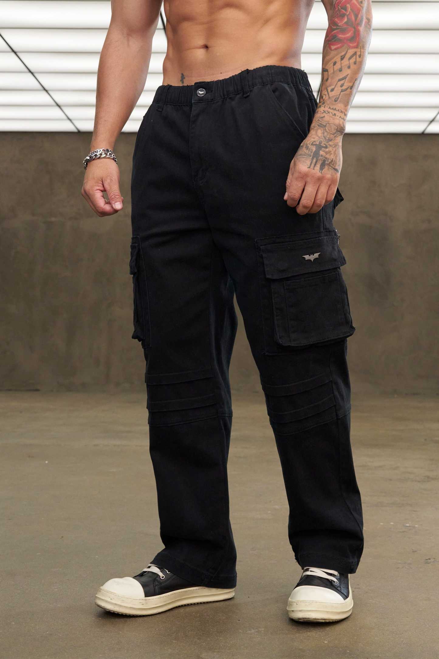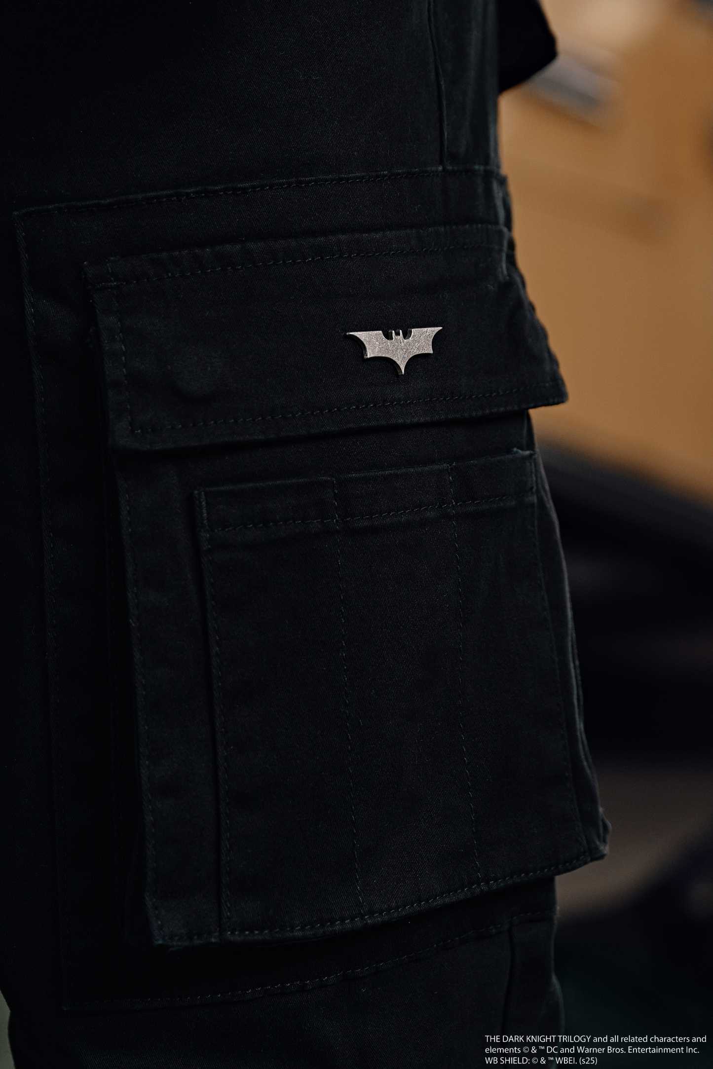 DESIGN: Tactical cargo pants reimagined through a minimalist, Gotham-inspired lens. Featuring dual side pockets with zip detailing, reinforced knee panels, and a subtle bat insignia, they balance structure and comfort with a refined street feel. Finished in a washed black tone for a versatile, stealth look.