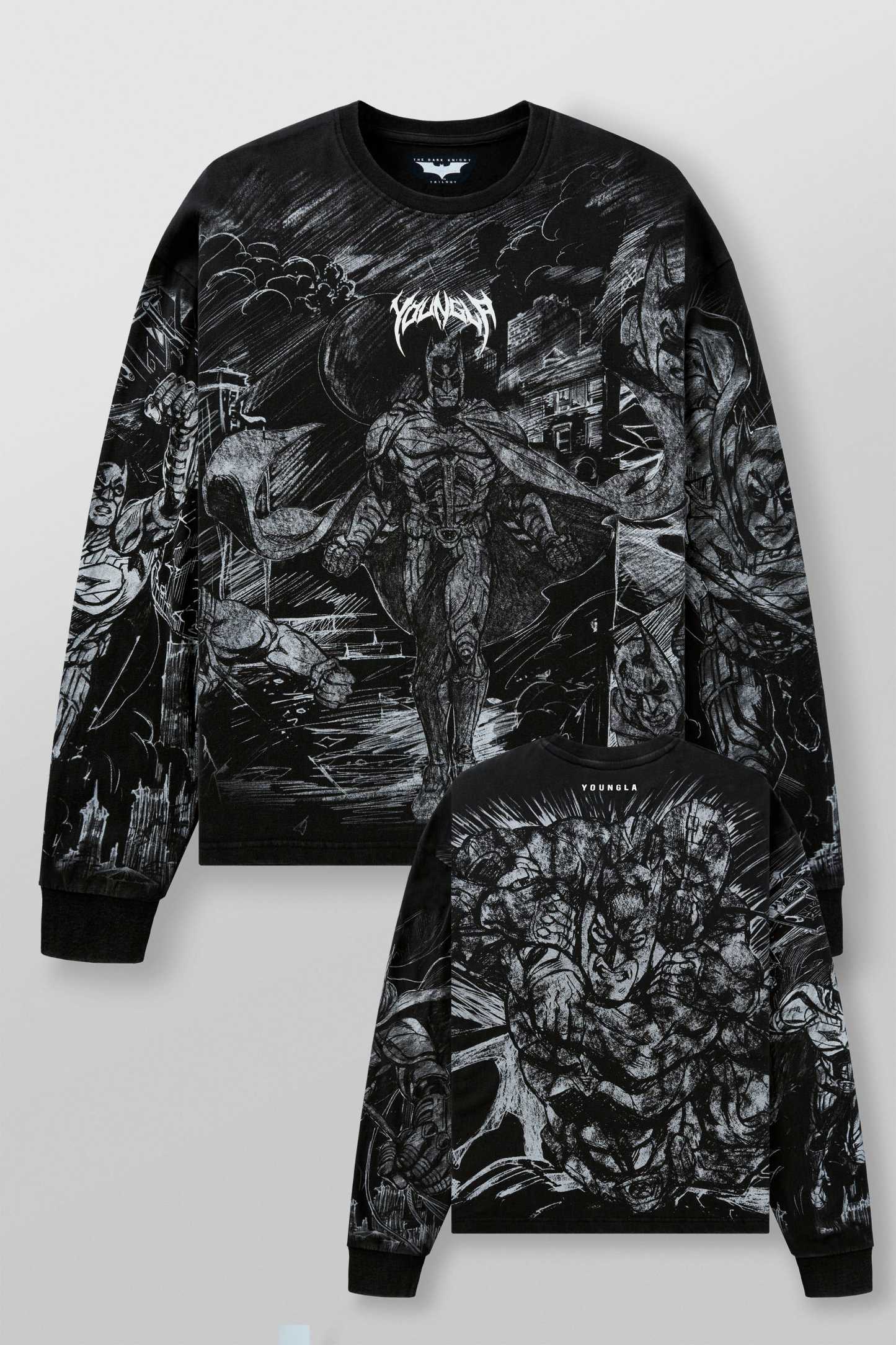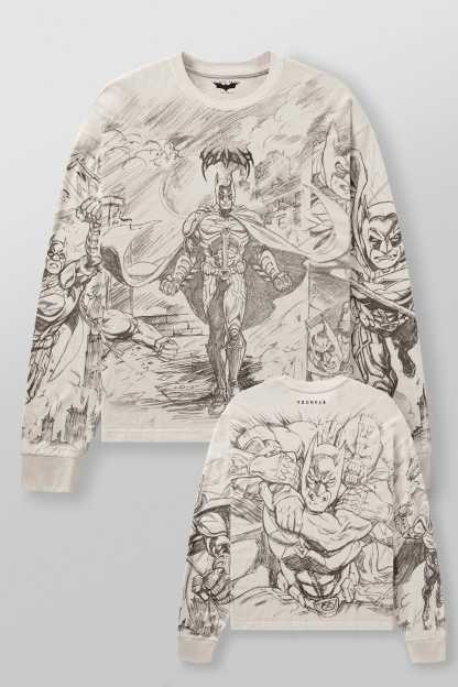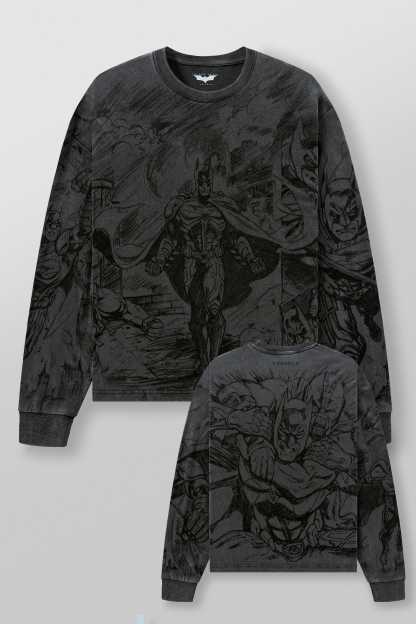 DESIGN: This crewneck features full-body comic artwork of Batman, wrapping across the front, sleeves, and back for an all-around illustrated look. The washed charcoal base softens the lines, giving the graphics a hand-drawn feel with depth and texture. Finished in a loose silhouette, it wears relaxed while still delivering a strong visual statement.