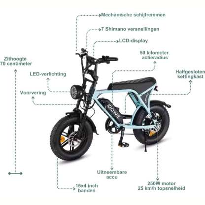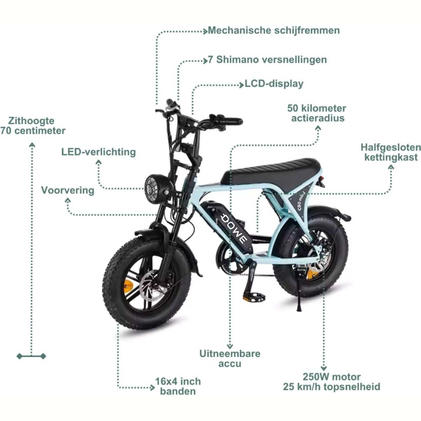 De Dowe C80 biedt de perfecte balans tussen kracht, betrouwbaarheid en stijl. Of je nu een praktische oplossing zoekt voor dagelijkse ritten of een avontuurlijke fatbike wilt voor offroad-uitstapjes, deze mini fatbike past zich moeiteloos aan jouw behoeften aan.