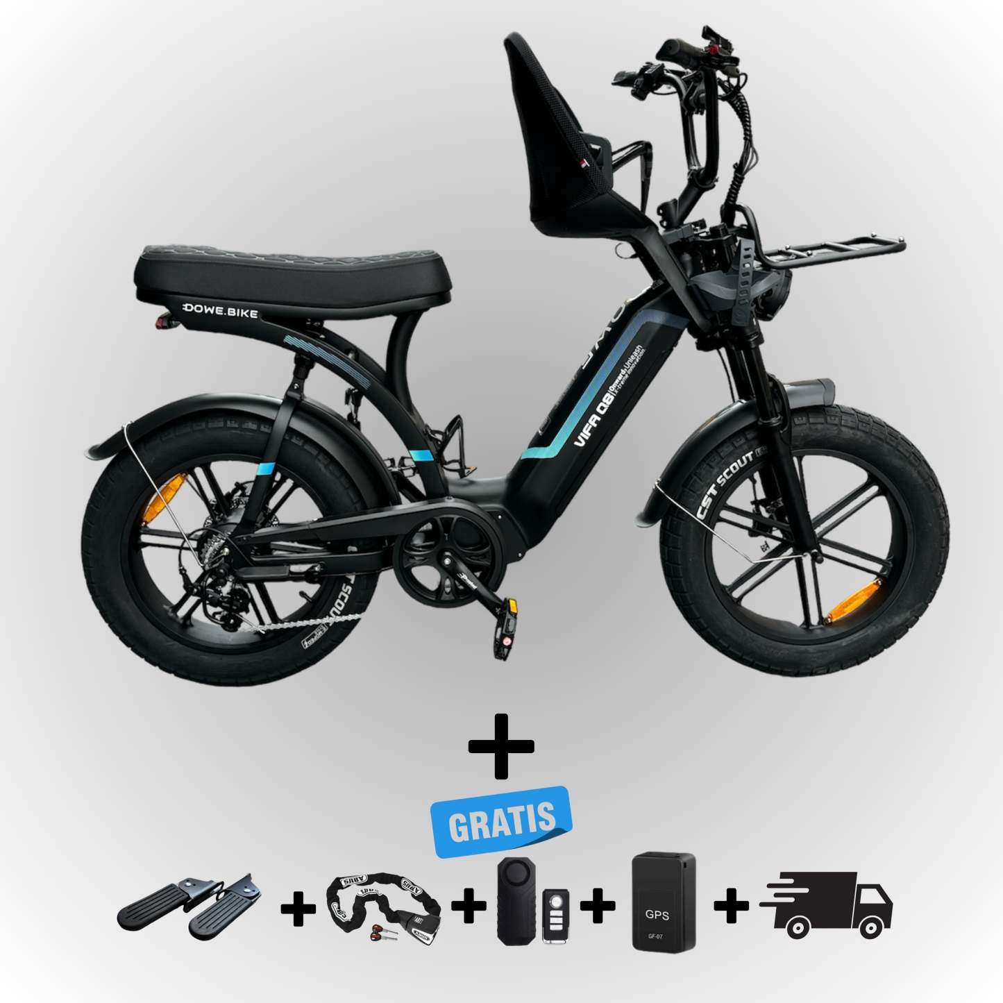 De Dowe Q8 Elektrische Fatbike met kinderzitje voor is speciaal ontworpen voor dames die stijl, comfort en veiligheid willen combineren. De lage instap maakt deze zwarte fatbike ideaal voor gemakkelijk op- en afstappen, terwijl het kinderzitje voorop zorgt voor een veilige en gemakkelijke manier om je kind mee te nemen. De krachtige 250W motor ondersteunt tot een snelheid van 25 km/h, ideaal voor stadsritten en avonturen in de natuur. Met hydraulische remmen biedt de Q8 betrouwbare stopkracht onder alle omstandigheden. Dit model is niet-opvoerbaar en voldoet volledig aan de wettelijke eisen. Bestel jouw Dowe Q8 bij Dowe.bike en ervaar de perfecte balans tussen comfort, functionaliteit en stijl, inclusief garantie en rijklaar levering.