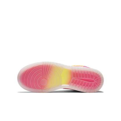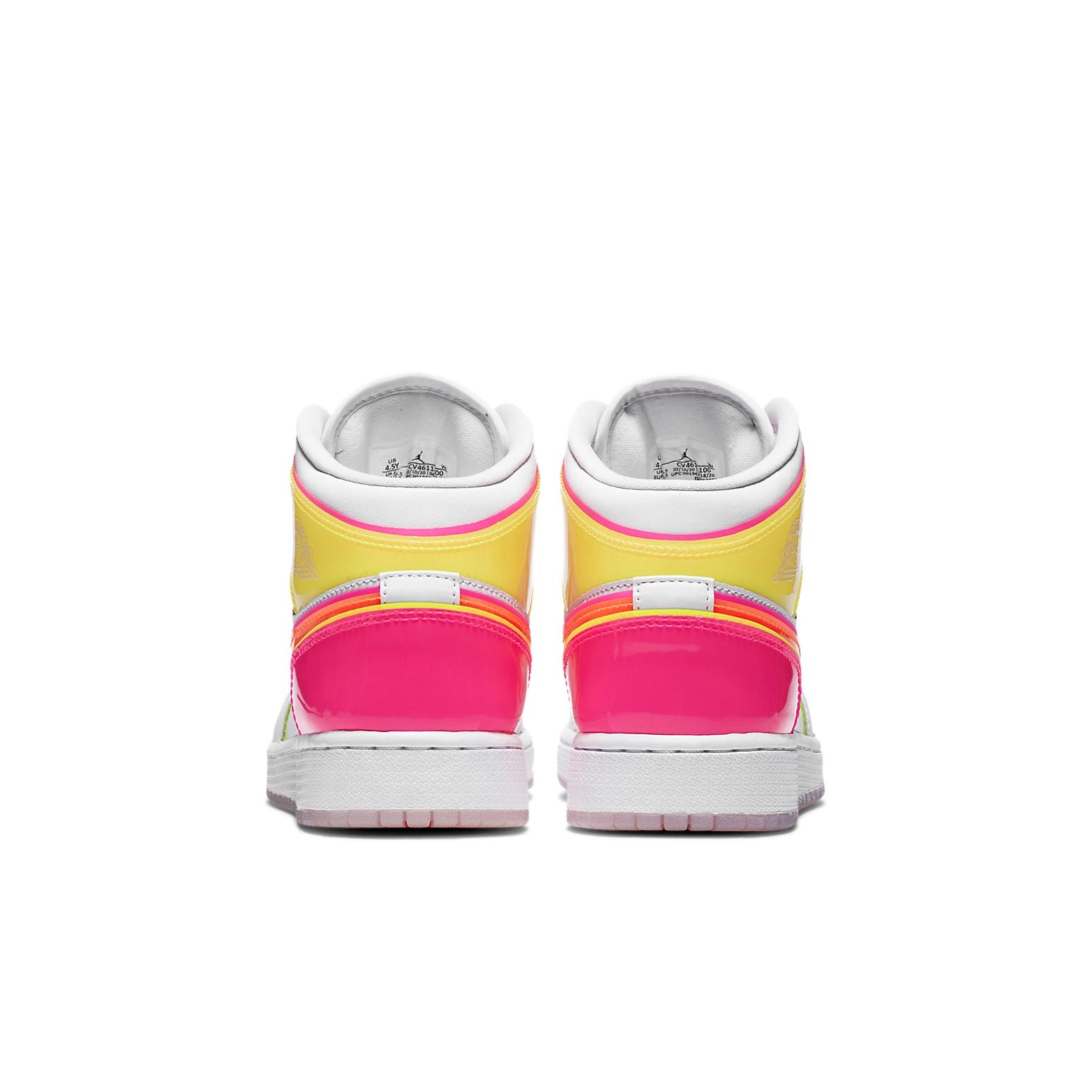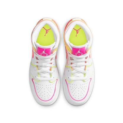 The colorful Nike Air Jordan 1 Mid GS "Edge Glow" gives the classic silhouette a neon twist. With white premium leather as the backdrop, all detailing such as the ankle and heel panels, Swoosh and eyestay are outlined with neon materials. Grab the "Edge Glow" if you want all eyes on you. Now available in children's sizes.