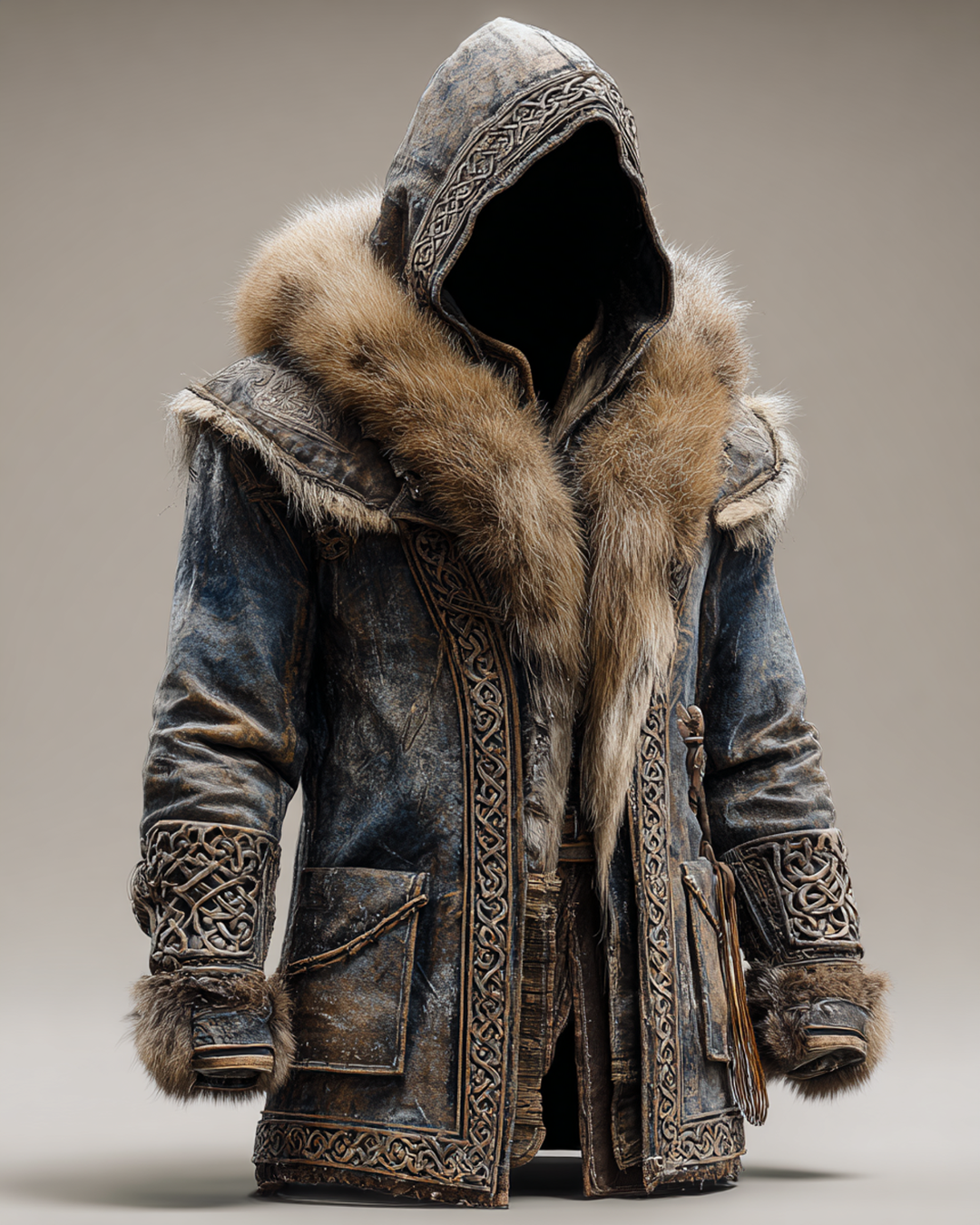 Men's Winter Nordic Viking Celtic Woven Embroidered Thick Warm Leather Coat 4159