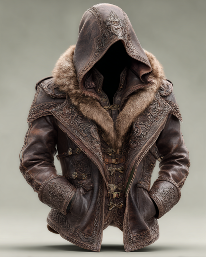 Men's Winter Nordic Viking Celtic Woven Embroidered Thick Warm Leather Coat 4279