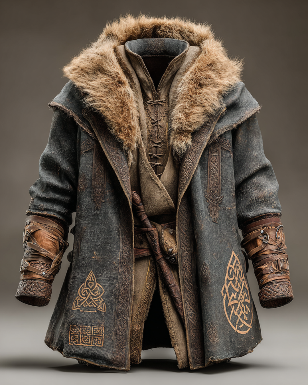 Men's Winter Nordic Viking Celtic Woven Embroidered Thick Warm Leather Coat 7139