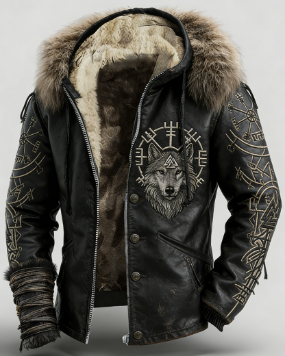 Men's Winter Nordic Viking Theme Tribal Wolf Embroidery Fashion Thick Warm Hooded Leather Coat 8757