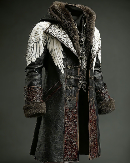Men's Autumn/Winter Nordic Viking Theme Wing Embroidery Fashion Thickened Warm Leather Jacket 3597