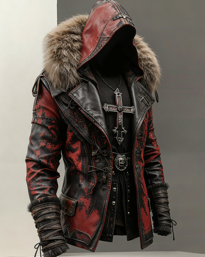 Men's Autumn/Winter Viking Style Cross Embroidered Warm Thick Leather Jacket 1504