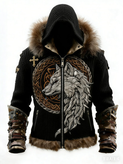 Men's Winter Nordic Viking Style Celtic Woven Wolf Totem 3D Embroidered Warm and Thick Coat 3995