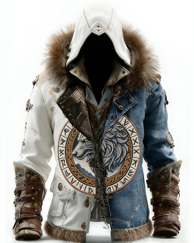 Men's winter Nordic Viking style wolf totem 3D embroidery warm and thick coat 4727
