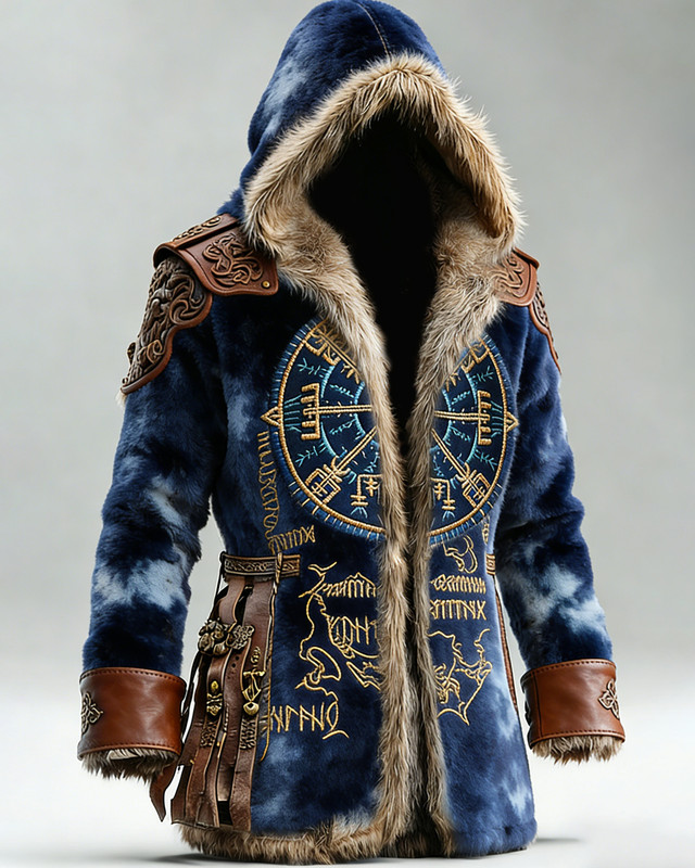Men's winter Nordic Viking style compass totem 3D embroidery warm and thick hooded coat 6175