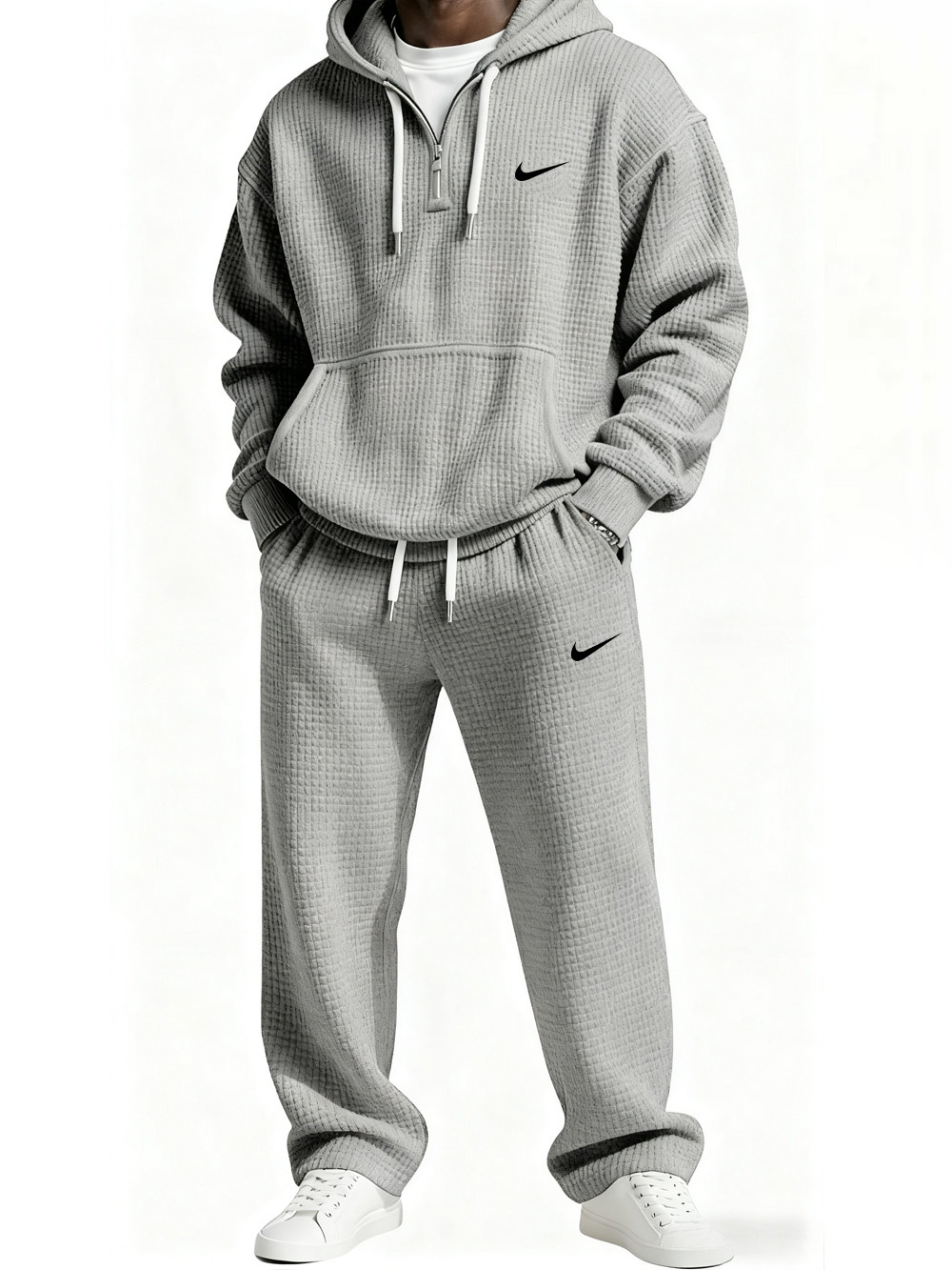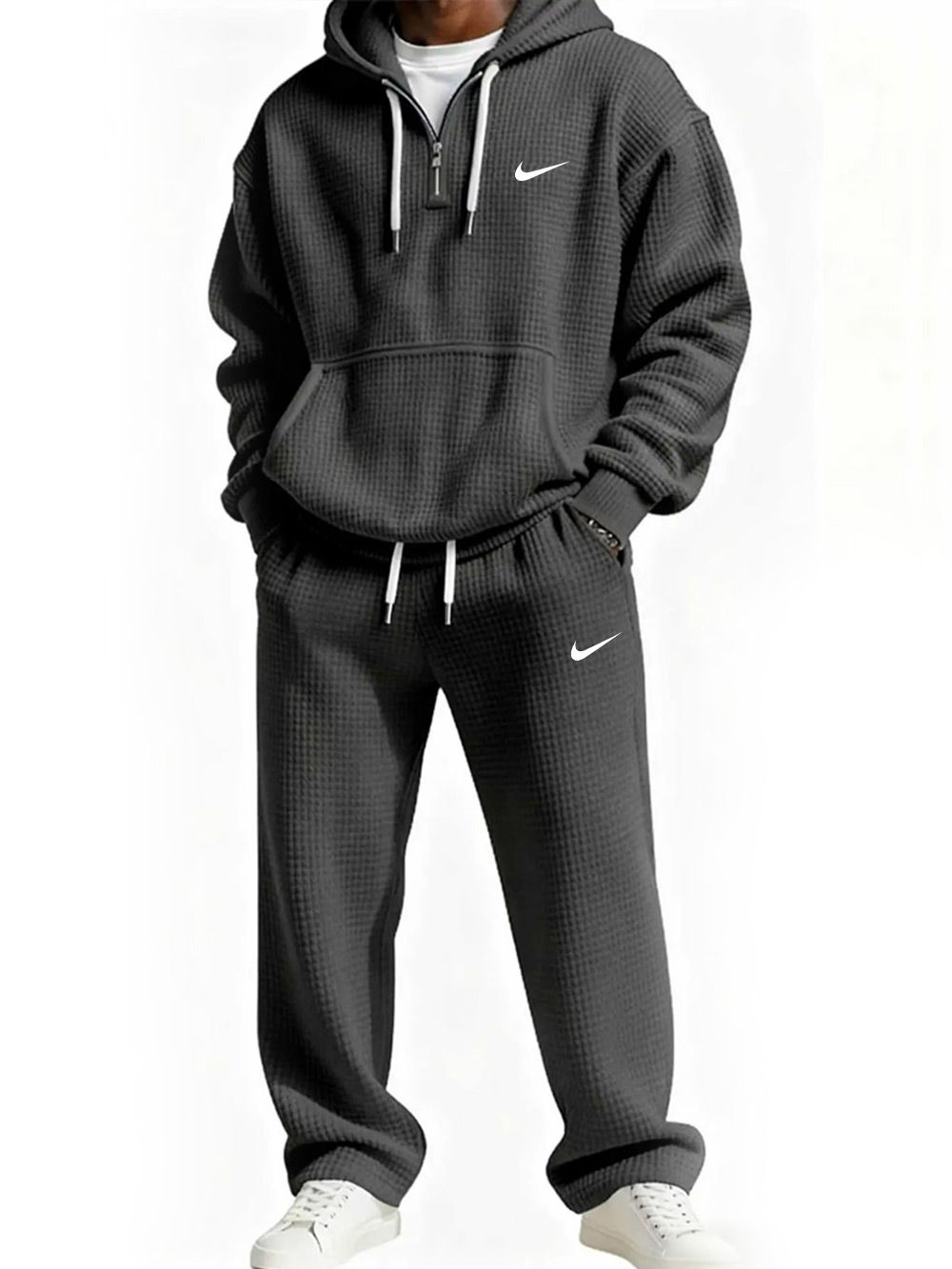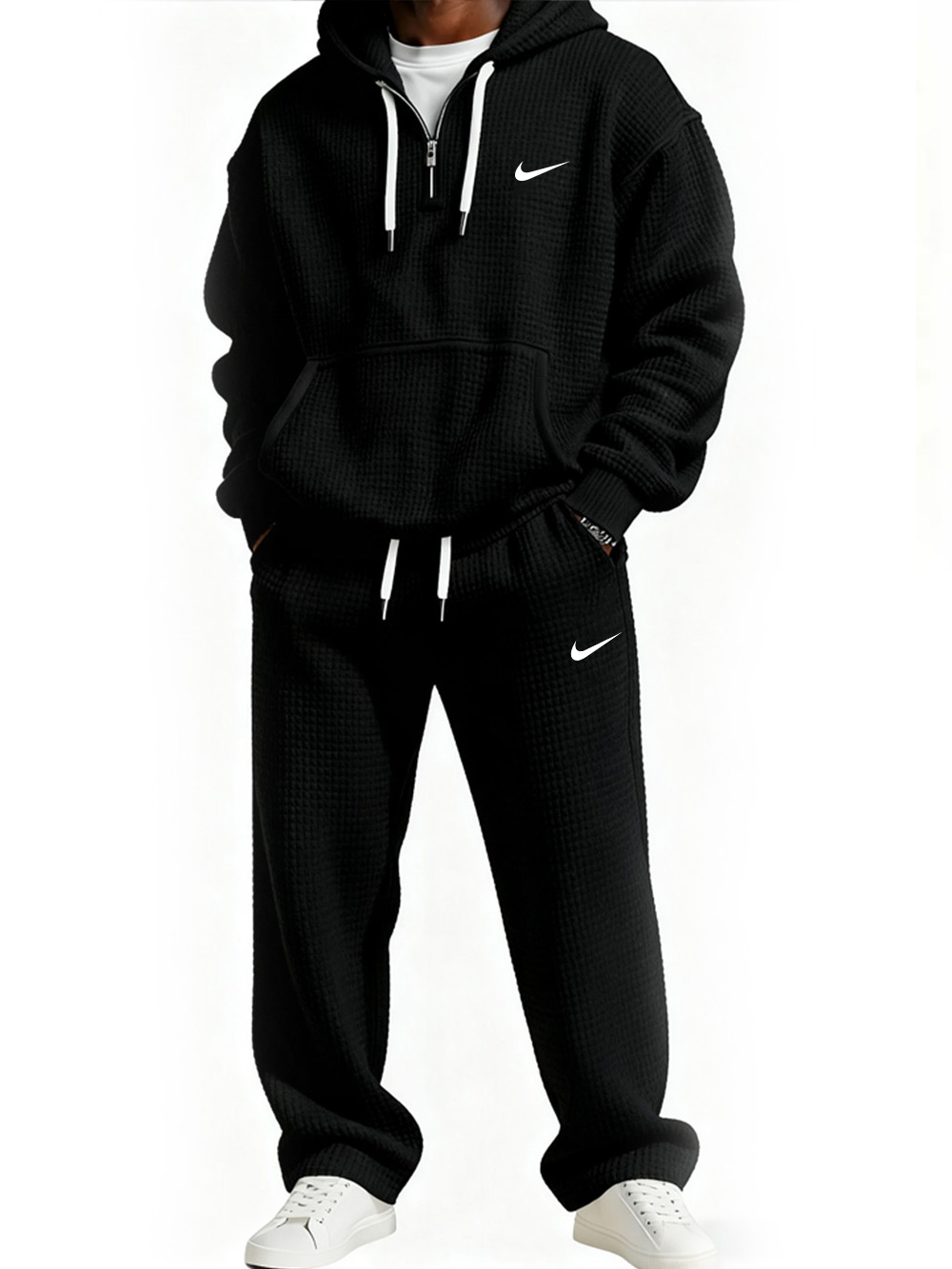 This hoodie and jogger set showcases a bold urban look with oversized logo prints and technical details. Featuring a half-zip hoodie with utility pockets and slim-fit cargo joggers , it combines functionality with modern streetwear style .