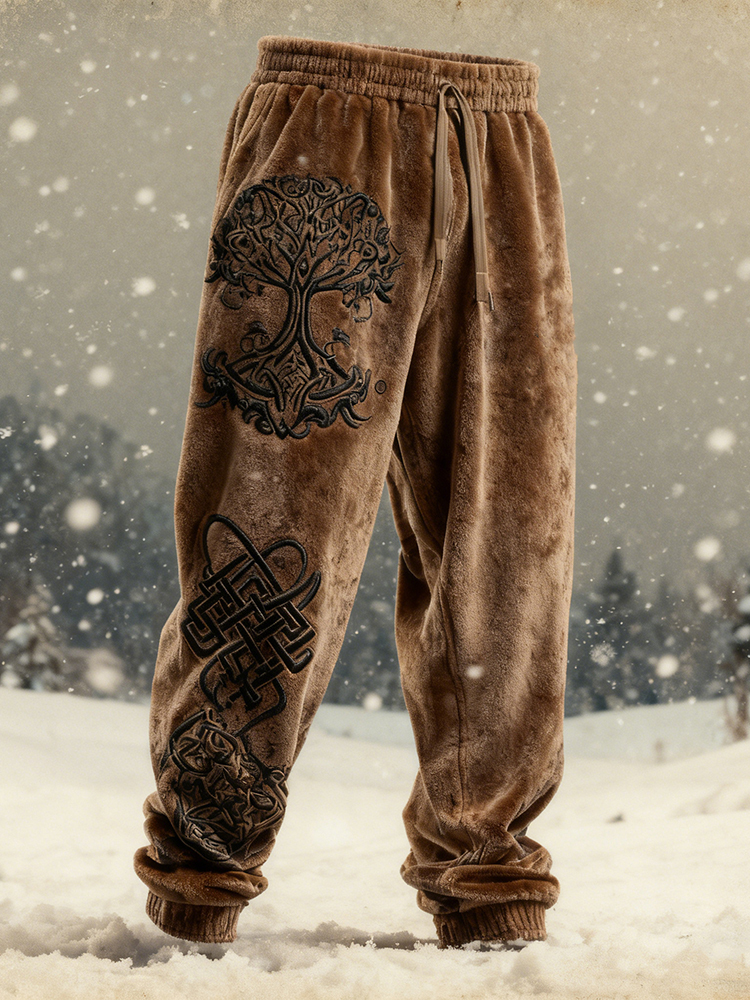 Men's Retro Viking Rune And Tree Of Life Pattern Plush Pants fc0c