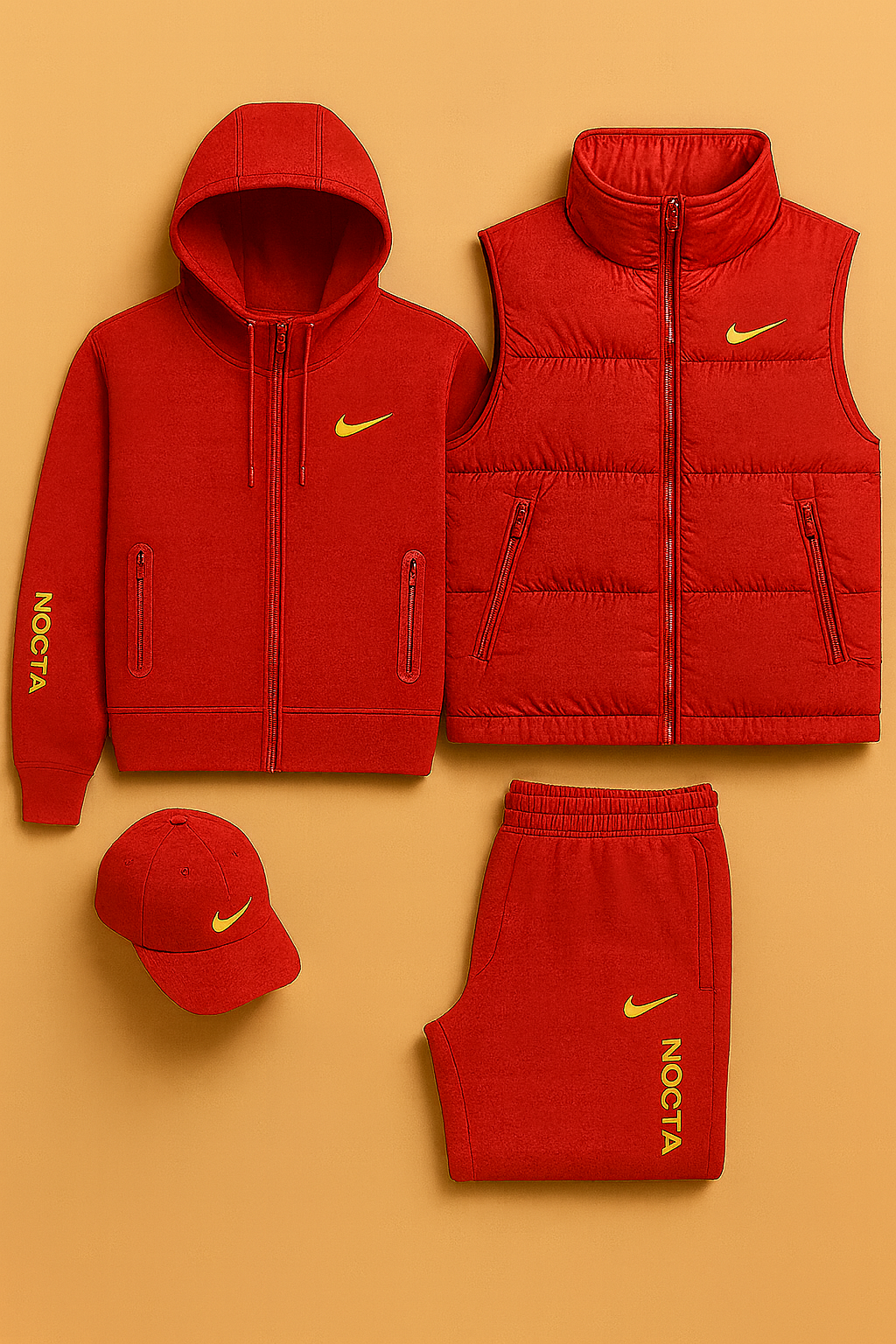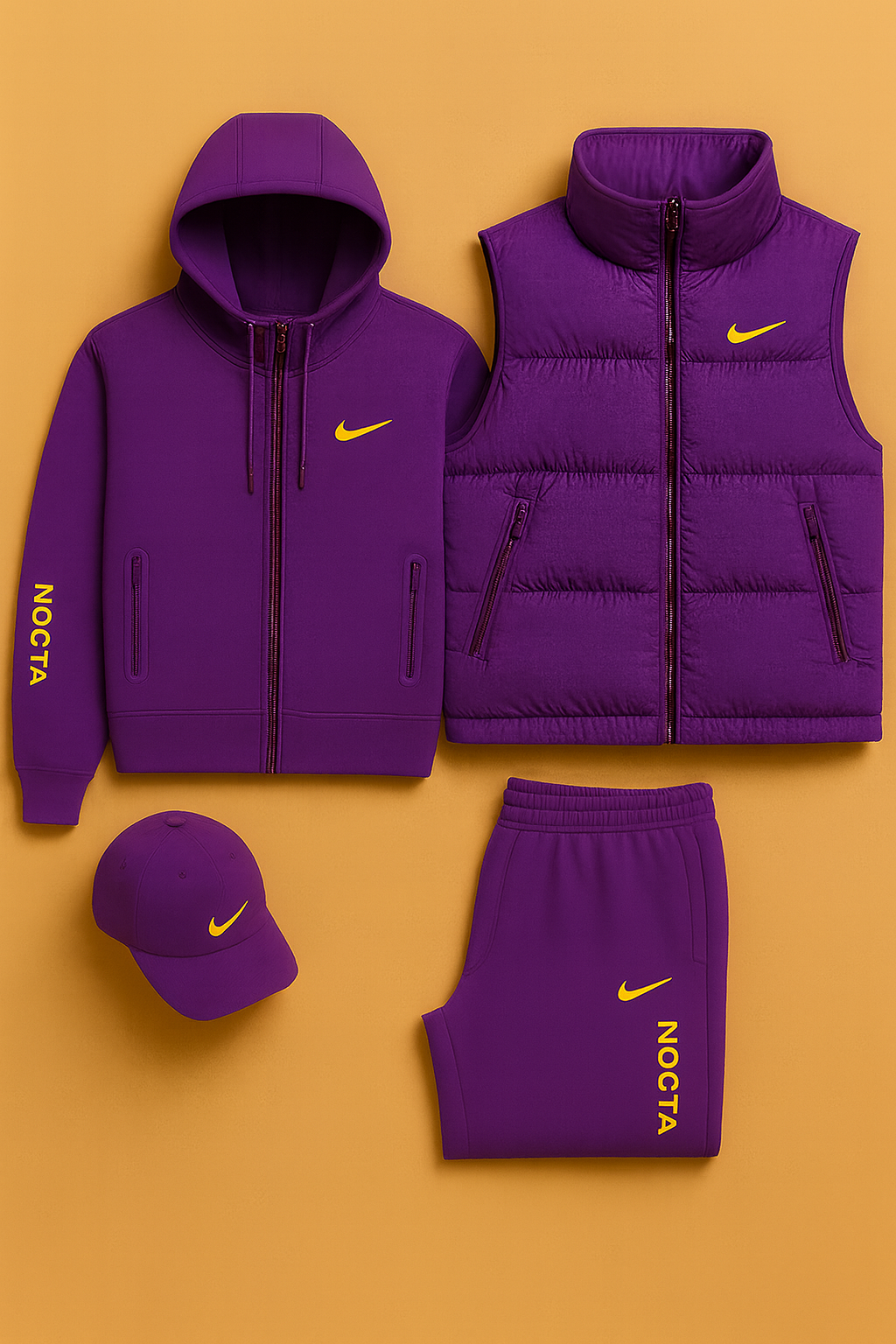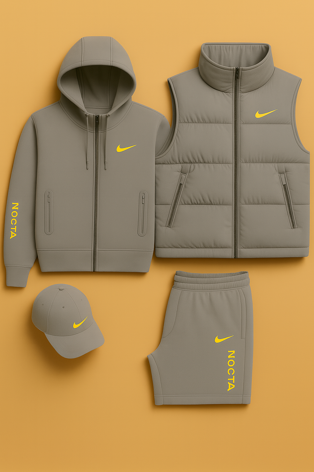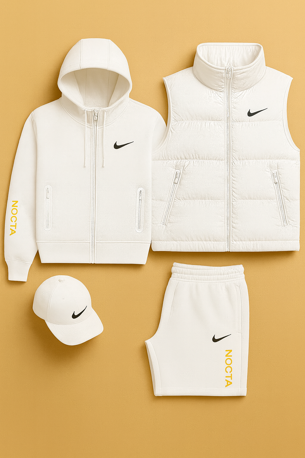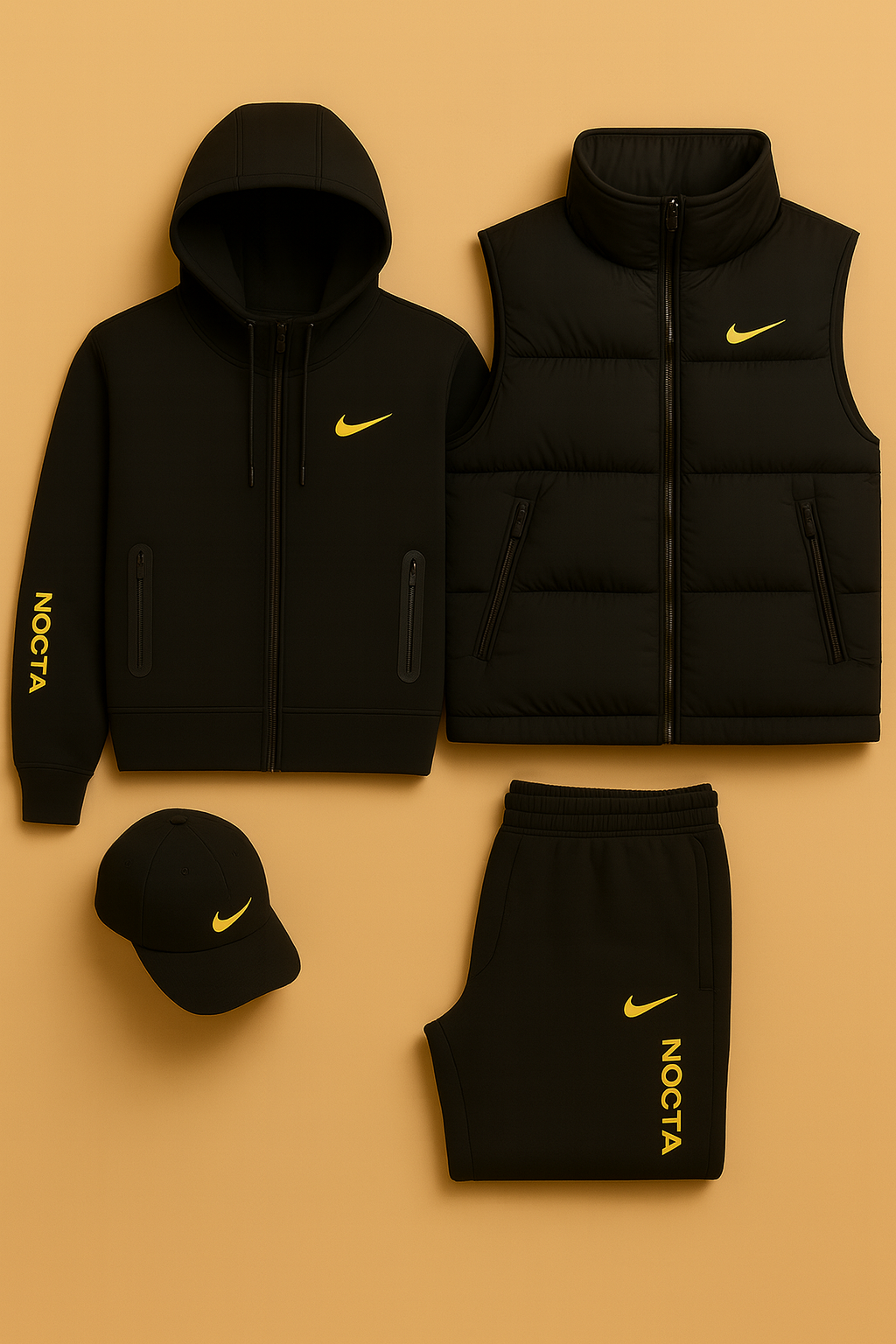 Dive into the exclusive style of the Nike™ NOCTA line — a collection designed for those who seek performance, comfort, and a clean, modern aesthetic. This total-black set, enhanced with signature neon-yellow detailing, brings together four essential pieces: a hooded sweatshirt, padded vest, shorts, and cap. Each item is crafted for maximum versatility, making the set perfect for everyday wear or for completing a bold, streetwear-inspired look.
