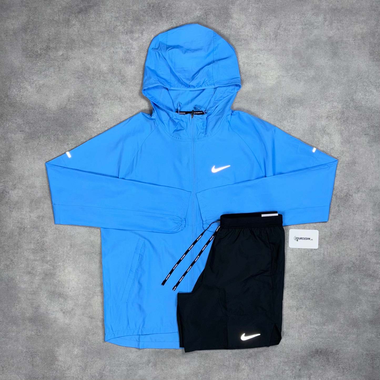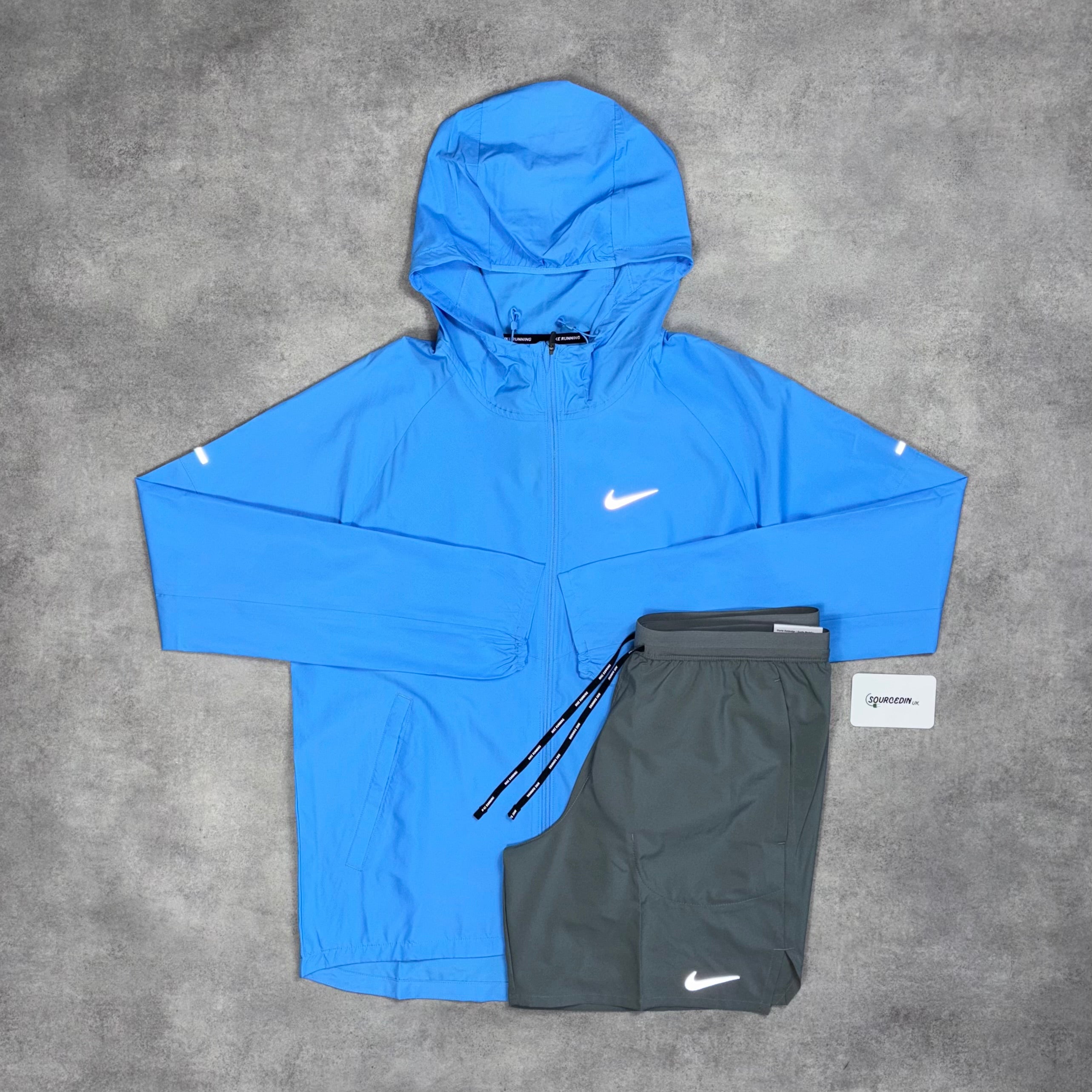Repel Miler Windrunner Jacket University Blue & 7” Grey/Black Flex Stride Shorts Set