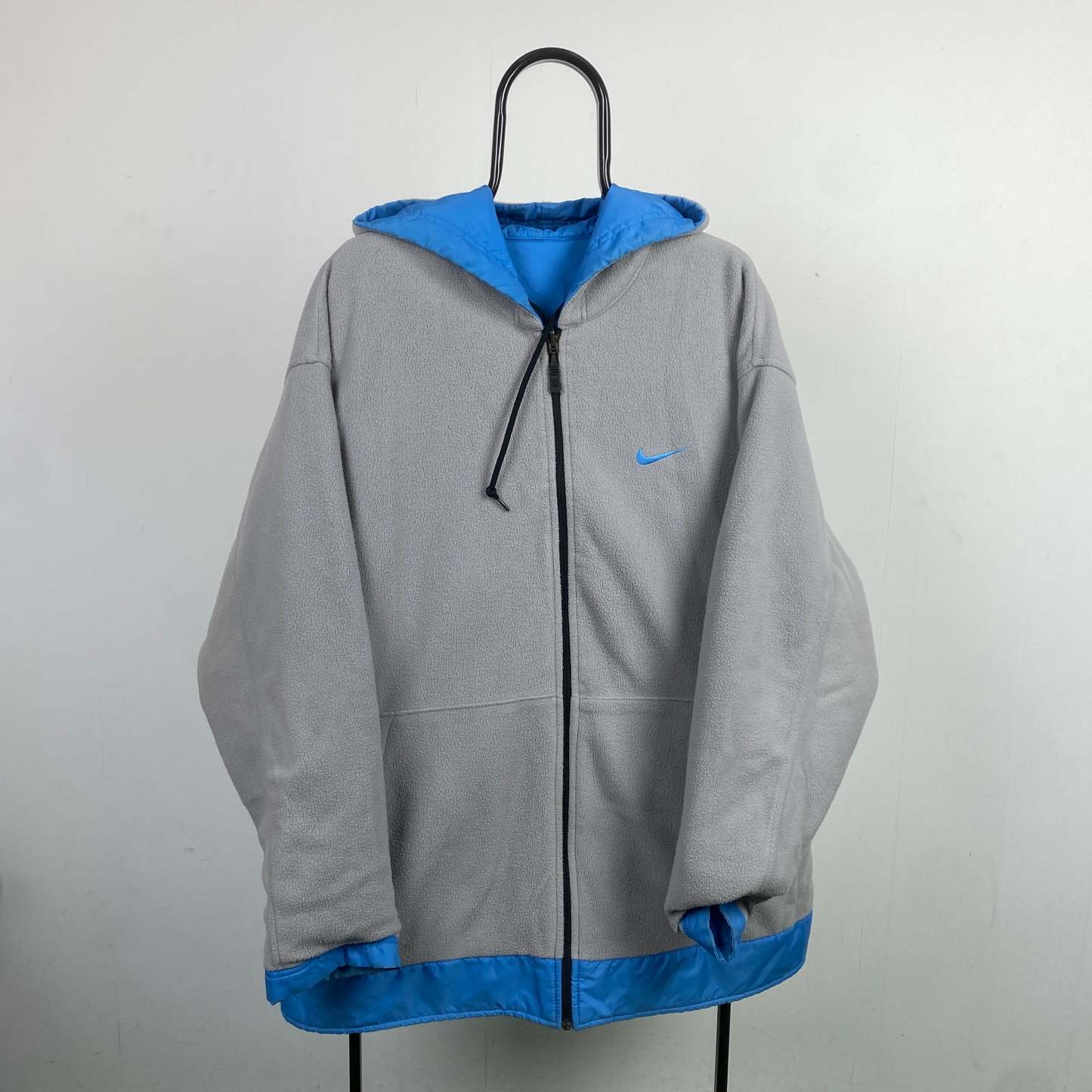 Switch your look in seconds. One side features soft fleece for warmth and comfort, while the other sports a smooth nylon shell for that retro techwear feel.