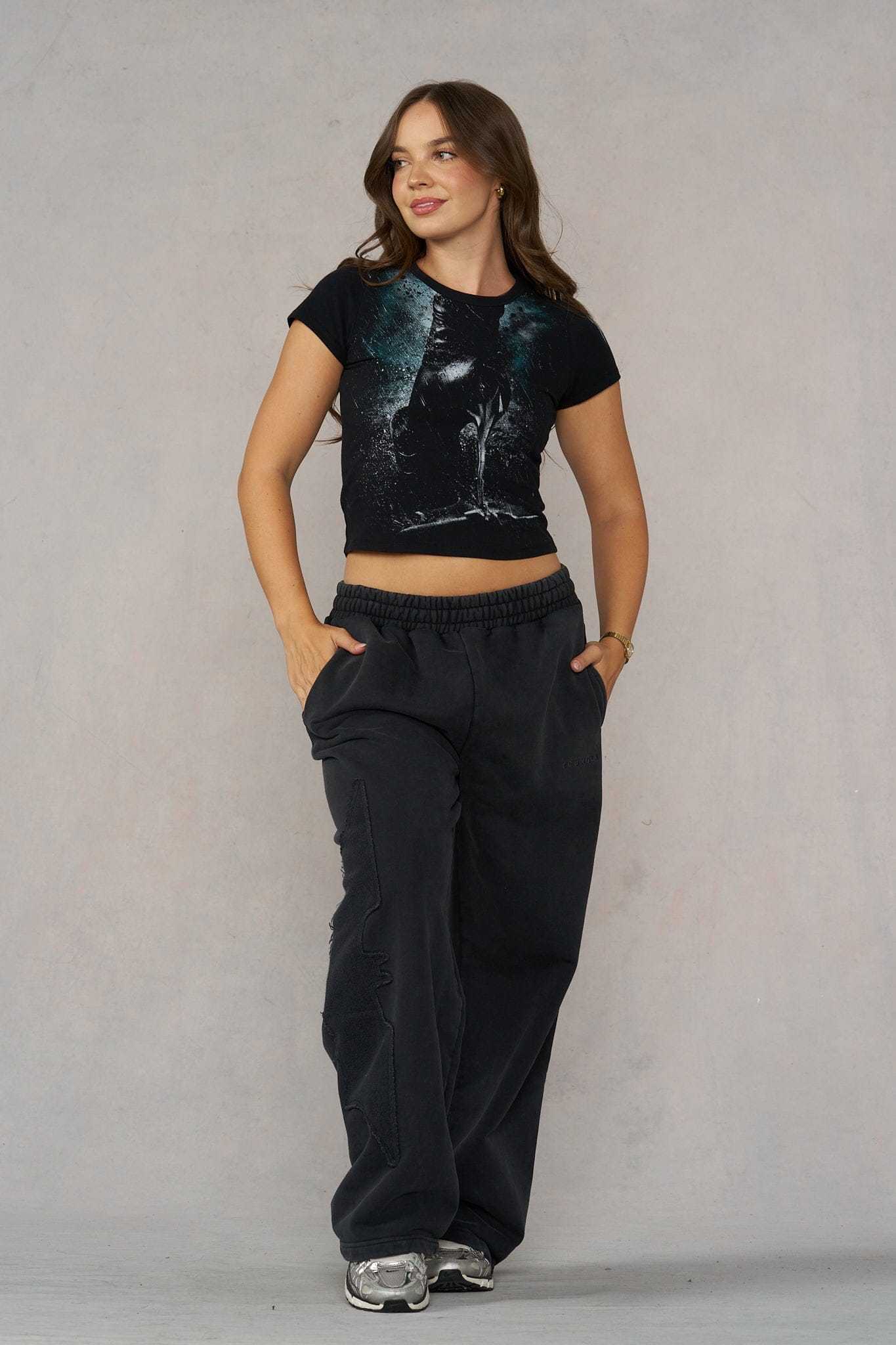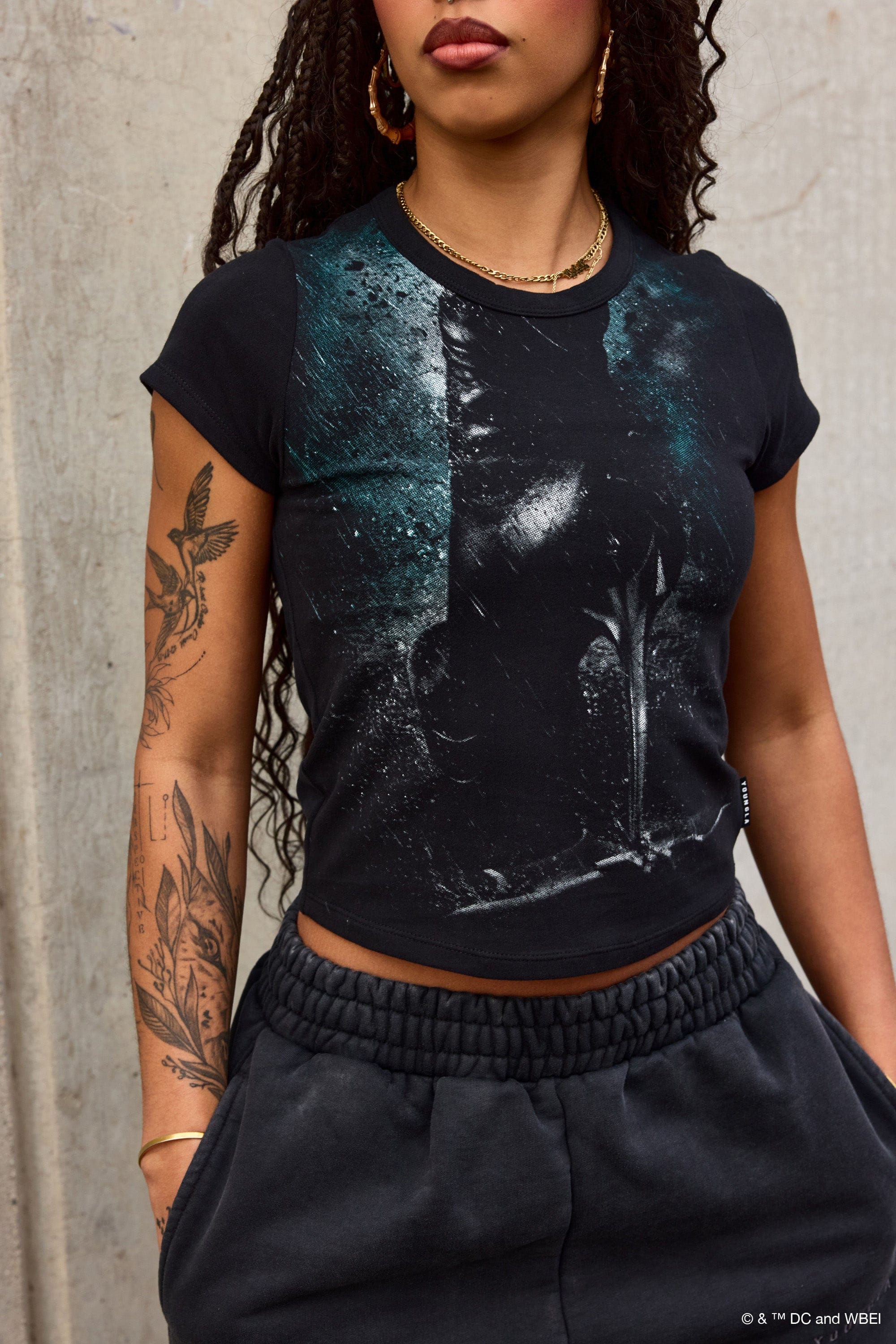 DESIGN: This soft, mid-weight women’s baby tee brings a sleek, slightly fitted silhouette with Batman-inspired graphics on the front and back. Stretchy and comfortable, it’s made for everyday wear while adding a playful, edgy twist to your casual rotation. Easy to style, easy to love.
